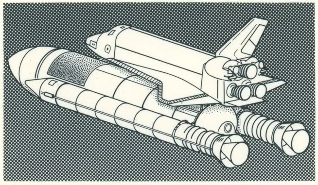 I mentioned how the WSJ kept breast of the technology of its today. Above is a technical drawing of the Space Shuttle, I assume previous to the infamous Challenger disaster. The background texture was made with an adhesive graphic film. Next, a conceptual illustration that appeared in full-column format: