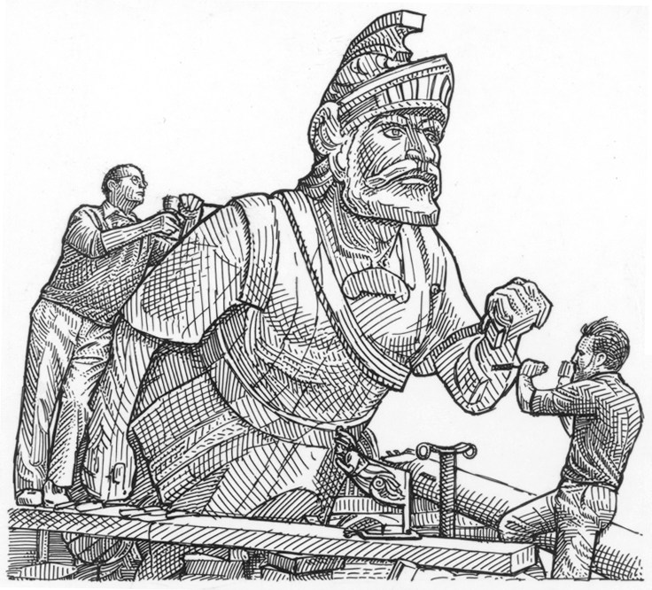 This drawing was probably rush job, as it is uncharacteristically loose. We see two carvers hewing out the sculpture for a bowsprit. Full-page on the front page… an “A*Hed” piece (4th column) I assume.