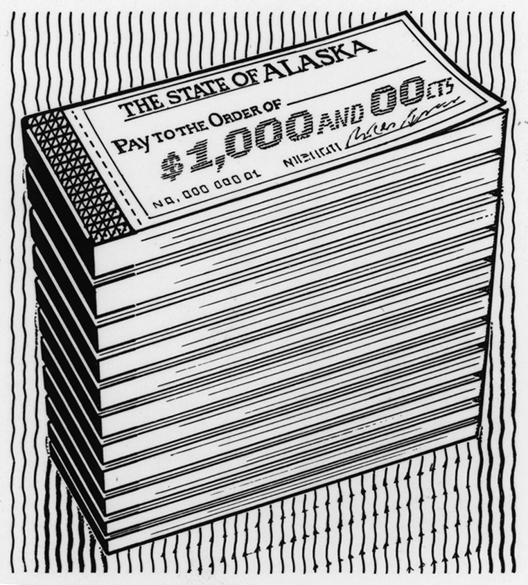 The above, labeled simply “Alaska” is a full-column illustration, I presume appearing on Page 1. The piece describing the legislation that brought about a pay-out to every Alaskan, every year, as a share of oil revenue earned in the state. At the time (mid 80’s) it was $1,000. per annum. This graphic image is interesting for the use of an irregular template that I utilize to create the squiggly vertical-line work. Using this pattern, I was also able to suggest the reflective effect beneath the piles of checks.