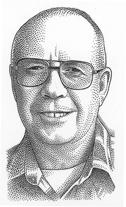 I love to get a photo to work from with good lighting, like this one. Mind you, this printed at width of less than 1-¼ inches in The Journal. I liked it well enough to sign it — bottom-left. The subject was Chuck Sanders (related to Bernie??)