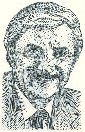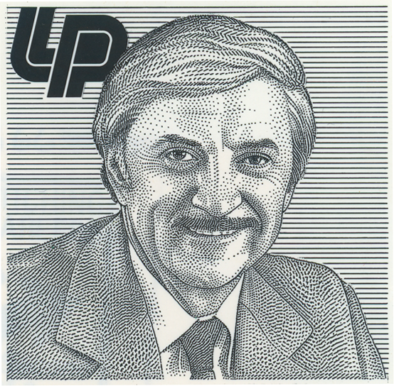I actually lifted the original portrait, which ran as a ½-column insertion, and embellished it with the company logo (Louisiana Pacific). Then, I seamlessly added to and filled-out the drawing, adding lapels, shoulder and background — not a bad feat!