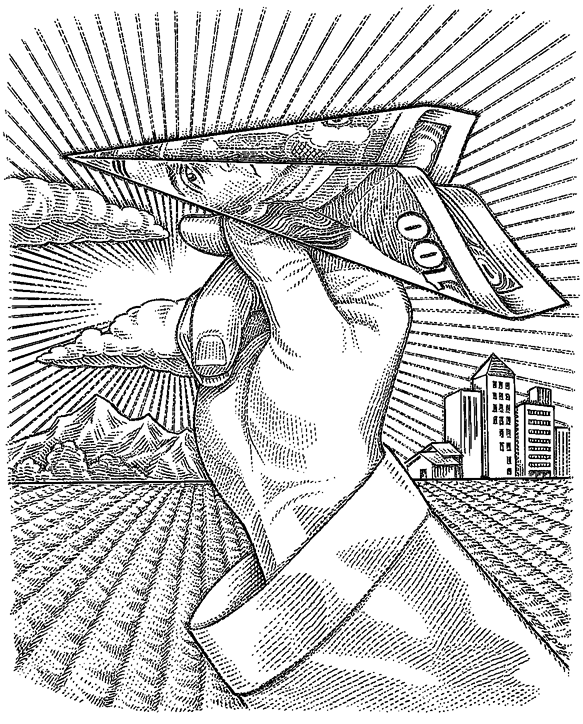 Also, in 2023, the Harringtons and I embarked on a conceptual piece: a Hand flying a Paper-Airplane made from a Franklin (a One-Hundred-dollar bill). After going through an easy sketch-phase…